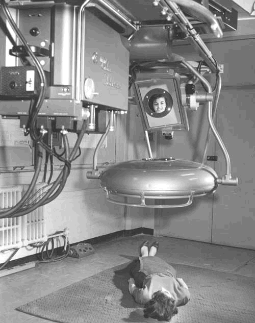 This picture shows an RCA color TV camera installation at at the Walter Reed Army Medical Center in Washington, D.C. in the 1955-56 period. This system was used to televise operations for instructional purposes. The round object in the center is a high-intensity lighting fixture with an opening in the center. The mirror above the lamp allowed the TV camera to focus on the operation as it proceeded. This picture was probably taken just after the installation was completed. It might be safely assumed that the patients were not expected to lie on the floor.